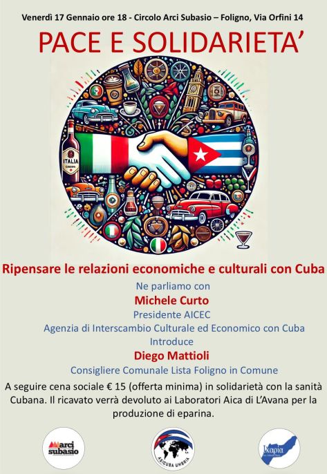 Venerdí 17 Gennaio alle ore 18 al Circolo Arci Subasio di Foligno incontreremo Michele Curto, Presidente dell’associazione di interscambio economico e culturale con Cuba.